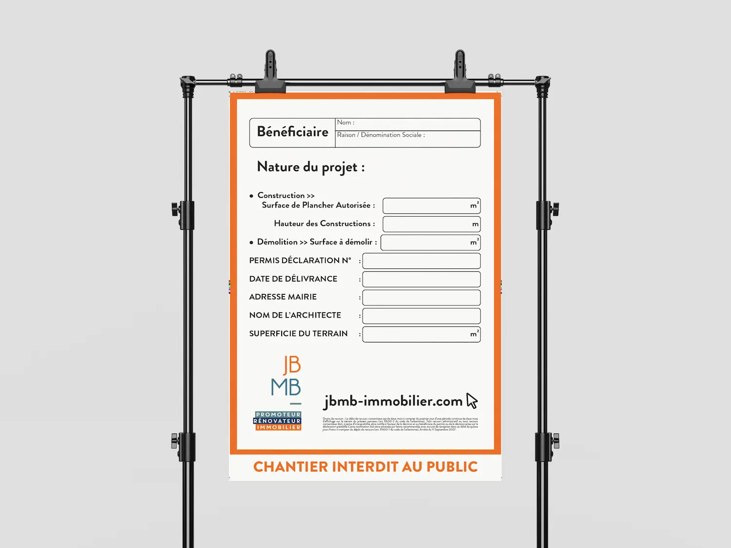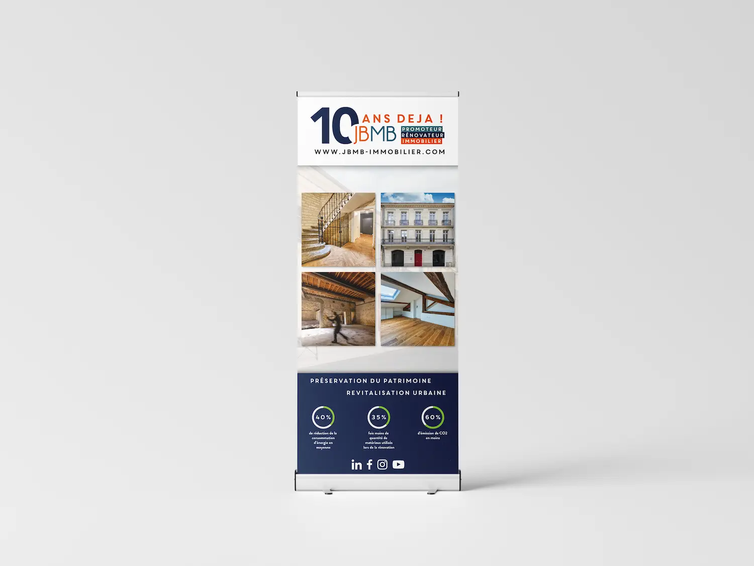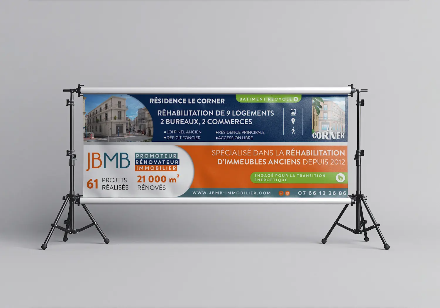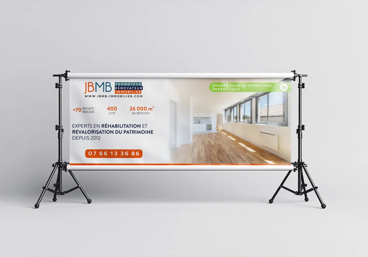 Signalétique & Grand Format : Conception de bâches publicitaires pour l'habillage de chantiers et de roll-ups événementiels destinés à maximiser la visibilité des projets immobiliers.